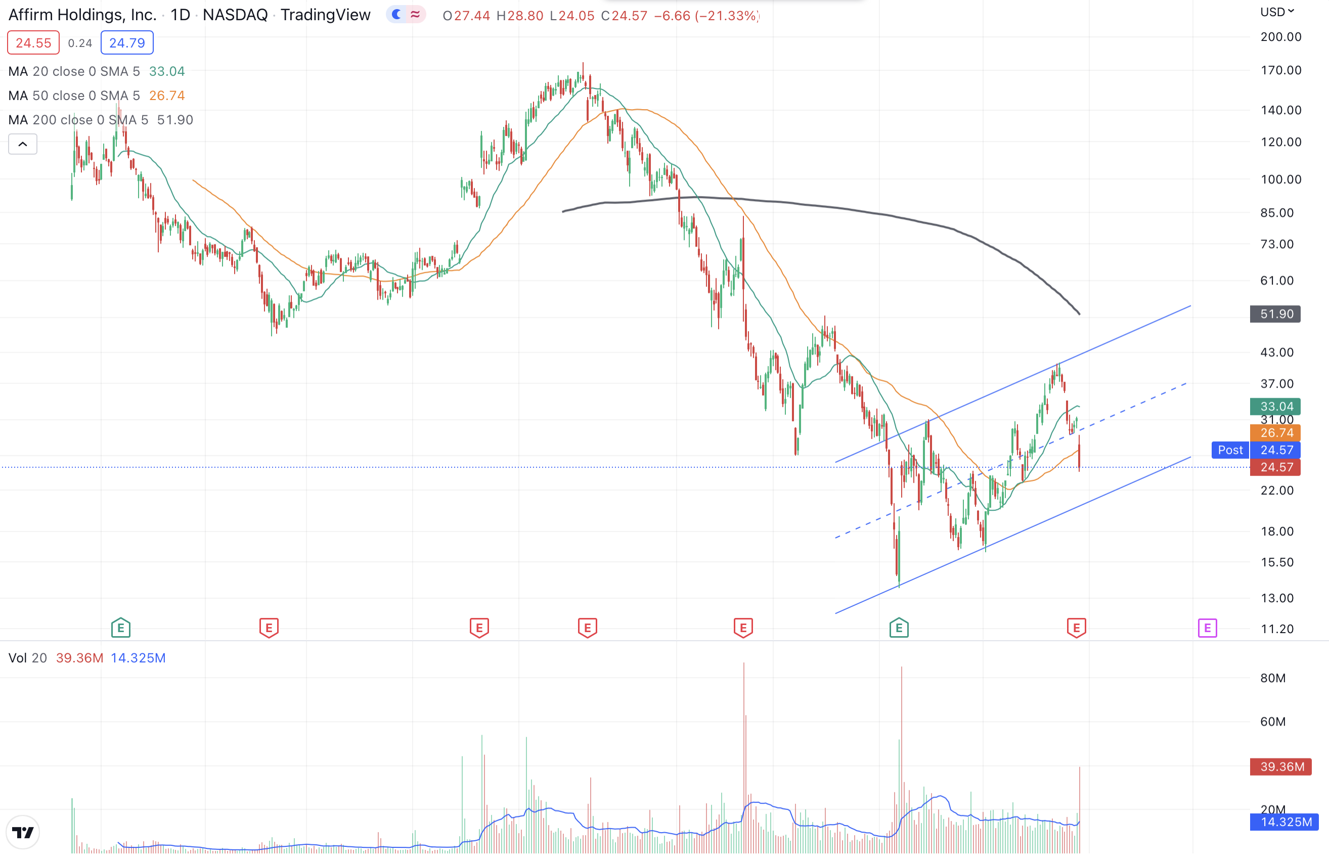 Technicals are also difficult in AFRM as it is all over the place. However a dip near previous lows of $13.64 could make the stock more appealing. A short is not a smart idea at this point as it could snap back very quickly with news and very difficult to control risk although it is tempting as short term looks to be headed down.