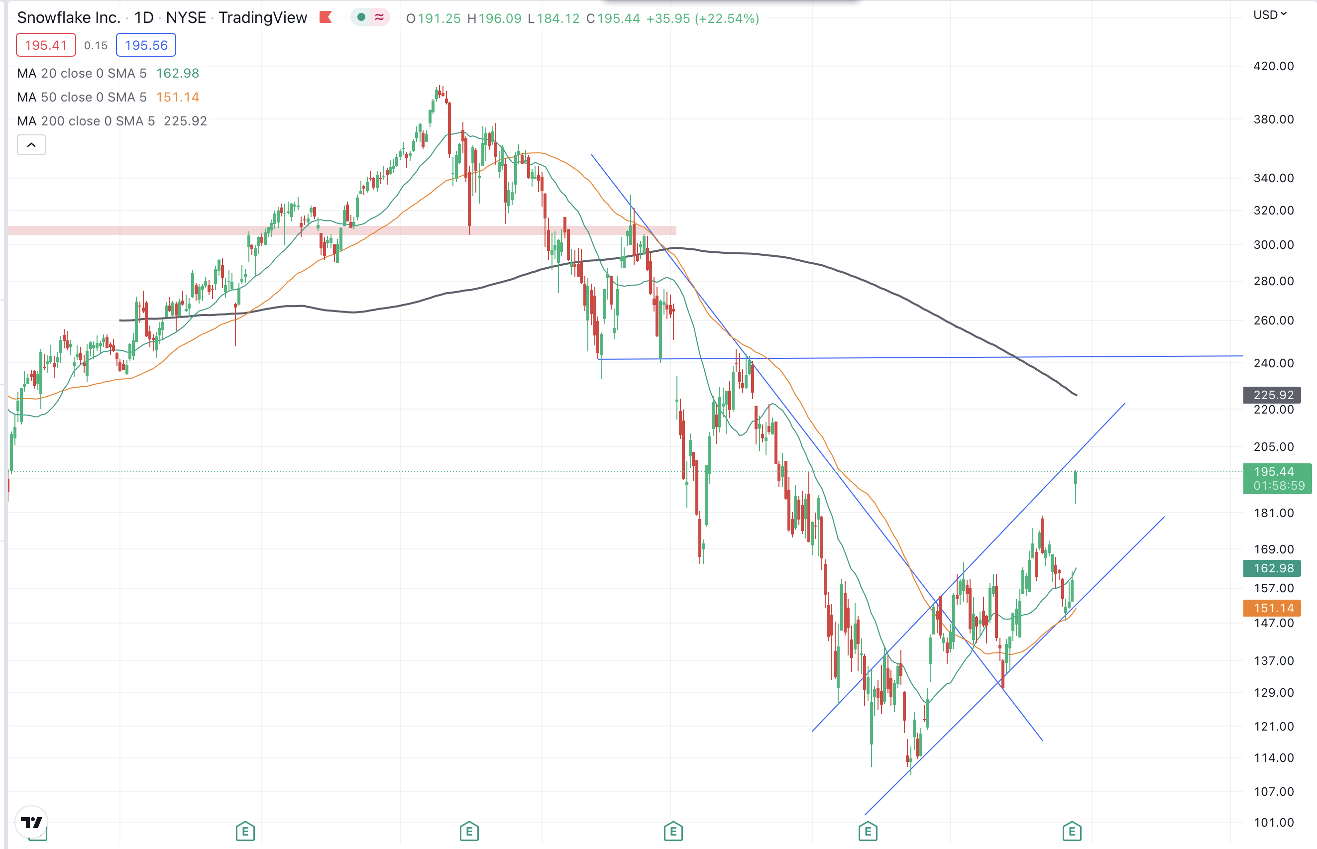 On the technicals side after todays 20%+ rally we are approaching resistance at $200 which also lines up with the recent trend line. Beyond $200 there's also resistance at the 200 day ma of $225 and at recent highs of $240. I am a long term investor of Snowflake and finding it difficult not to sell some into this rally, given current market conditions. Instead I sold some November $240 calls, maybe even just for the fact of making me feel like I did something. Sometimes we have to quench our own thirst for action, even though more often than not, it is best to sit tight.