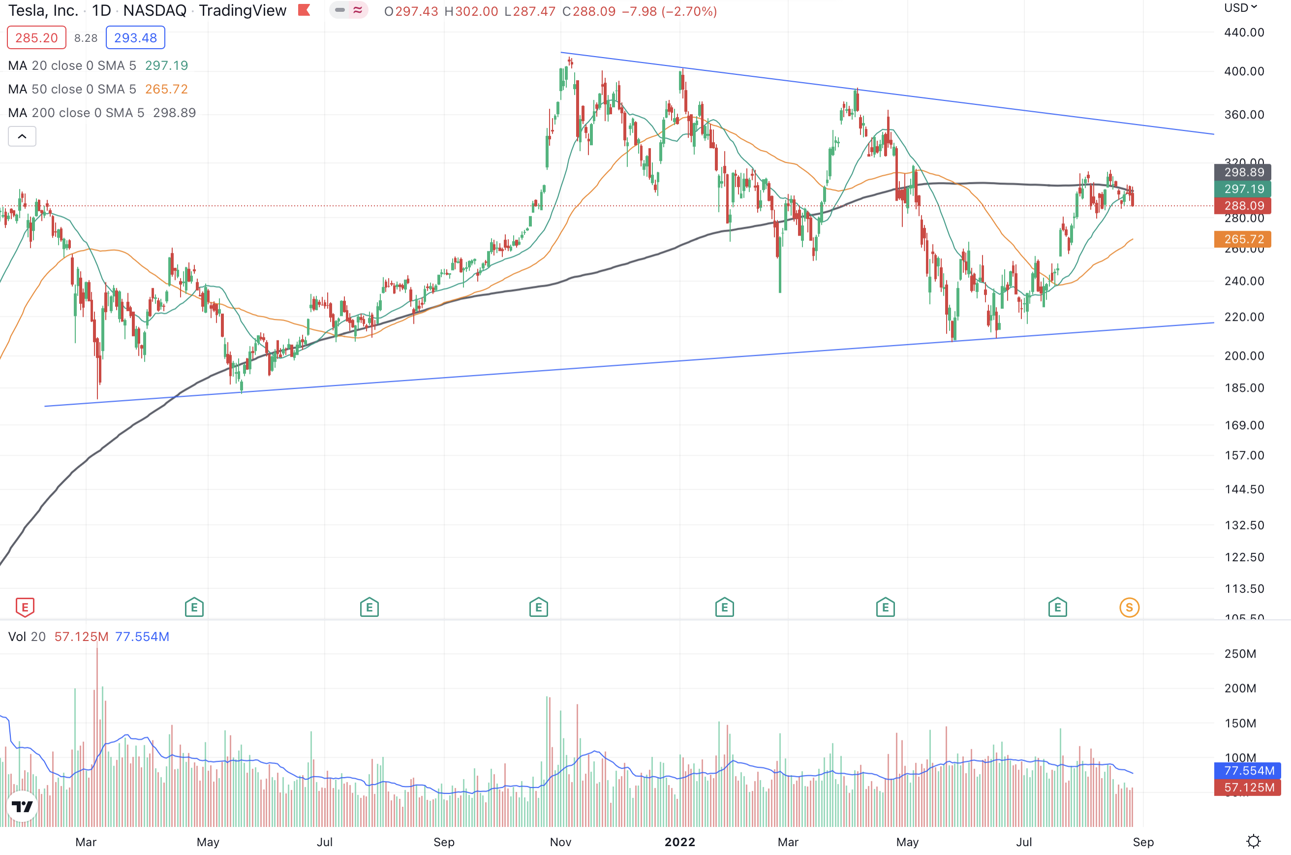 Technicals: TSLA might be trading in a range between $215 and $340 in near term, but this will all depend on the overall market, and of course if there are any major changes to fundamentals. I will be watching from the sidelines but might dip my toes through LEAPS if there is a set up in technicals as the long term story here is compelling and funds will continue to add to their positions.